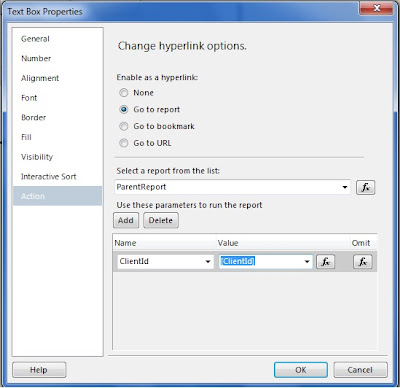 Then select the Go to report radio button, and select the target report from the drop-down list. And Add the perameters for the targetting report by clicking on Add button.
